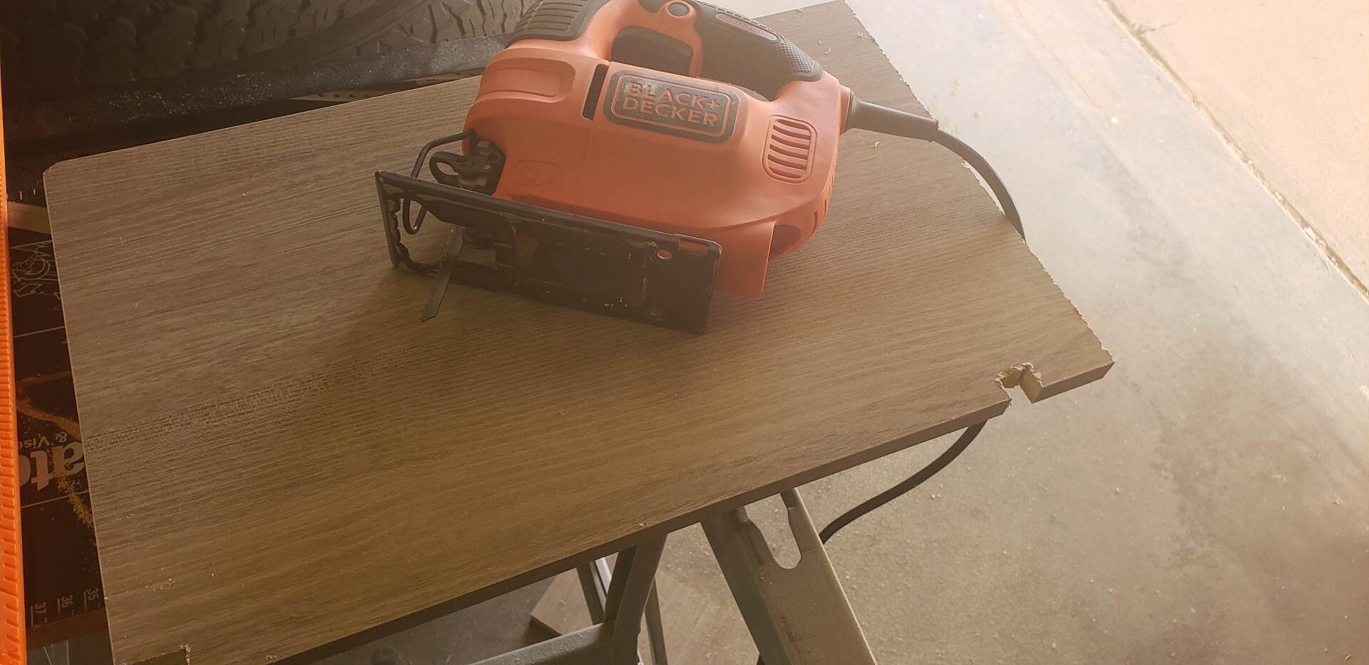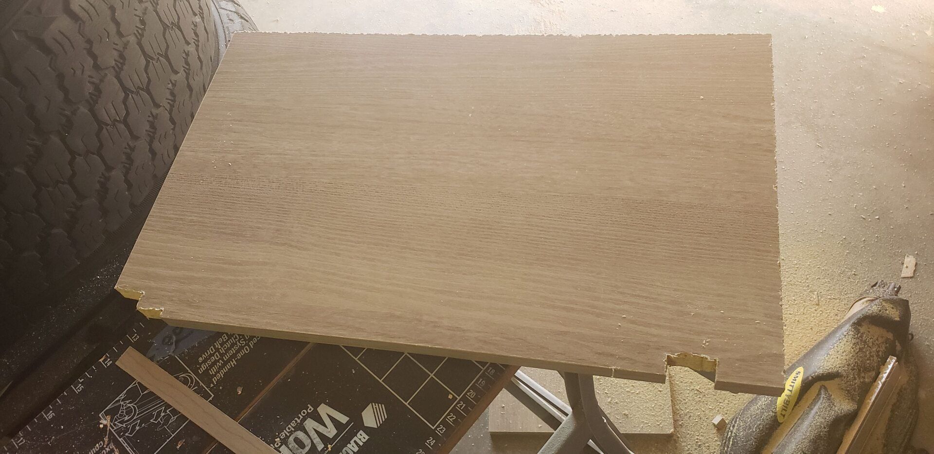 Next, i took a rubbermaid shelf, in organic ash, and cut it to length. Holding the shelf in place, use a pencil to roughly outline the location of the latch, and cut it out with a jigsaw.