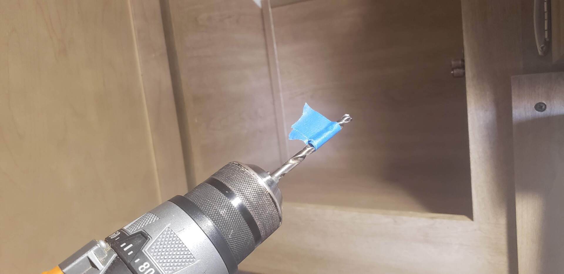 Now, take a 1/4" drill bit and drill two holes along the line we drew in pencil. One hold toward the front, and one toward the rear. I used a piece of masking tape on the drill bit to prevent accidentally drilling to far. Don't want any holes going through the trailer!